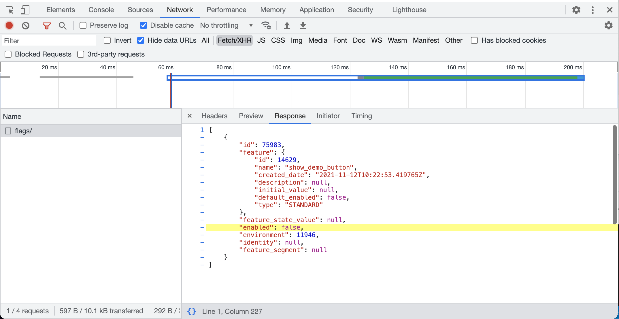 You can see here that the flag is being returned by the Flagsmith API and it has "enabled": false as the value.